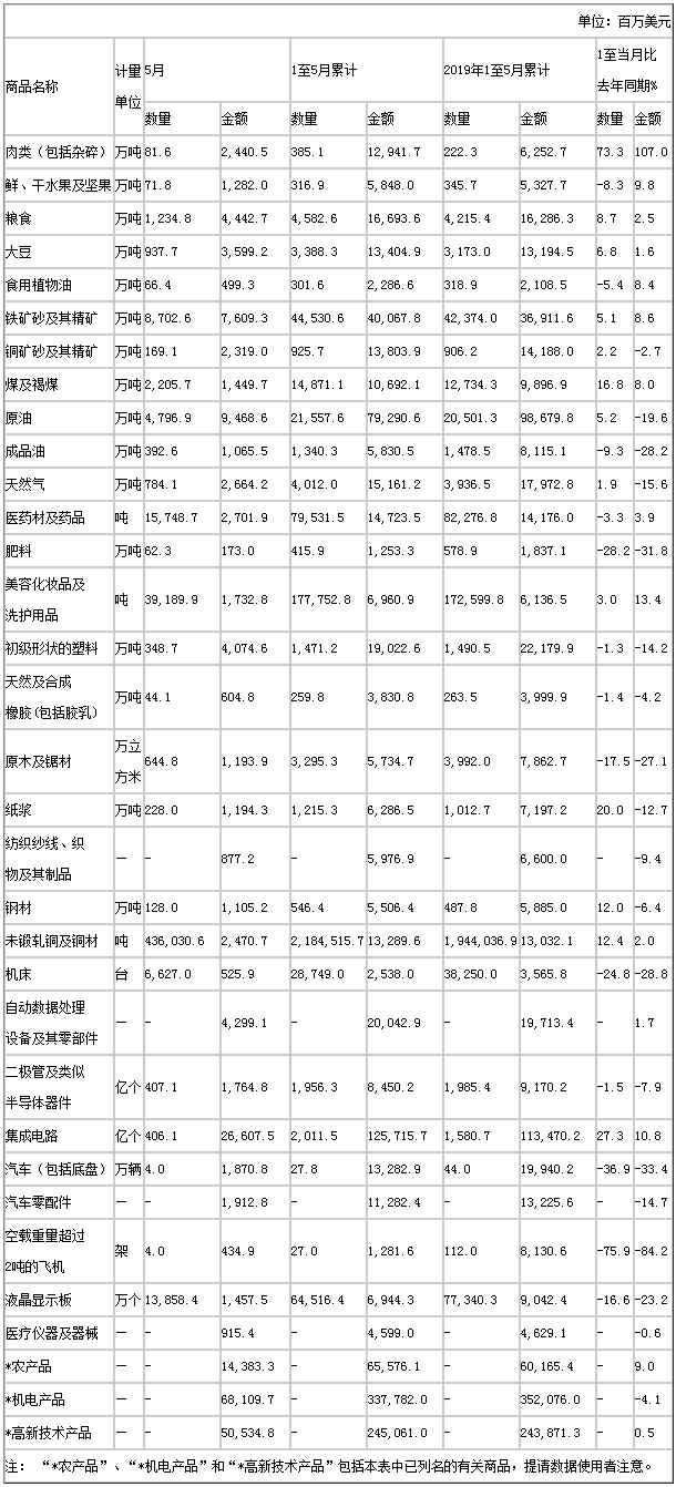 2020年5月全国进口重点商品量值表(美元值)